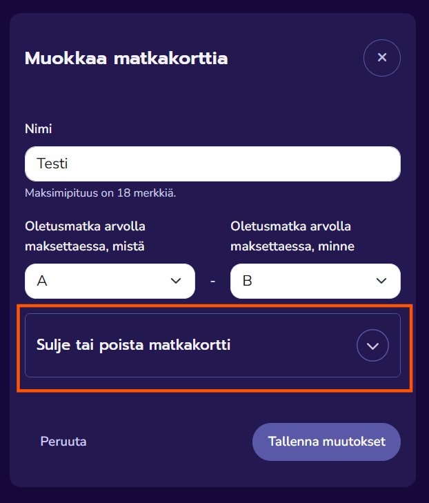 3. Avaa valikko ”Sulje tai poista matkakortti”