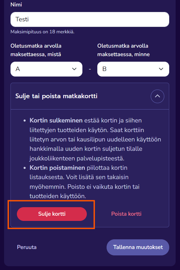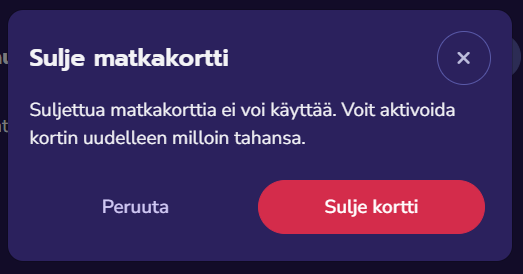 - Kortin sulkeminen estää matkakortin ja sen sisältämien tuotteiden käytön.
