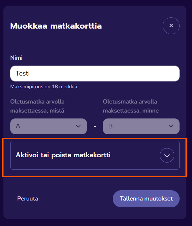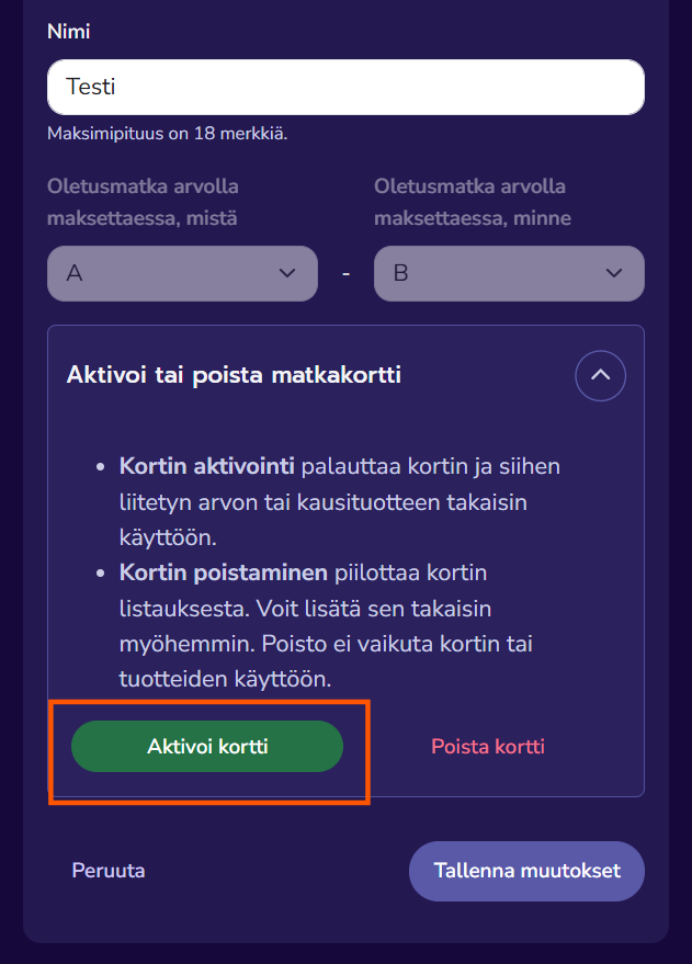 3. Avaa valikko ”Aktivoi tai poista matkakortti”