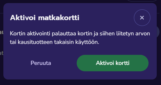 - Aktivointi palauttaa kortin ja sen tuotteet takaisin käyttöön